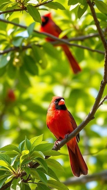 The male boasts a bright red body contrasted with a black mask around the face, while females display a softer, reddish-brown hue. Cardinals are known for their melodic songs, which can often be heard echoing through backyards and woodlands.